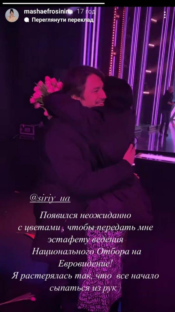 Також Єфросініна показала в Інстаграм, який сюрприз приготував для неї Сергій Притула, який раніше був ведучим нацвідборів. Він прийшов на майданчик, Центр культури та мистецтва Національного авіаційного університету, щоб передати естафету Маші та особисто побажати удачі. Сергій підніс колезі ніжний букет тюльпанів та мандарин.