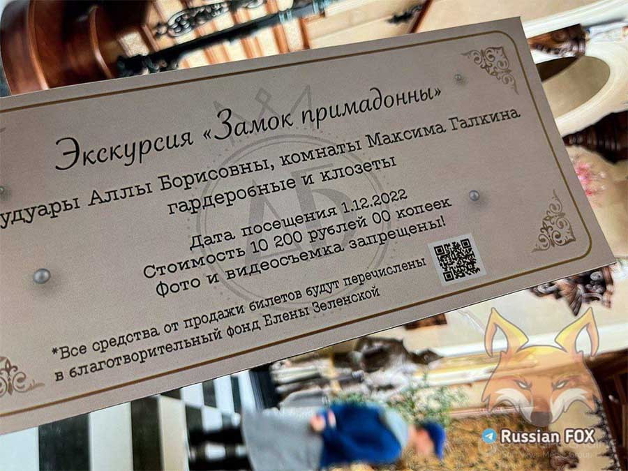 «Екскурсія „Замок примадонни“. Будуари Алли Борисівни, кімнати Максима Галкіна, вбиральні та клозети», — йдеться на квитку.
