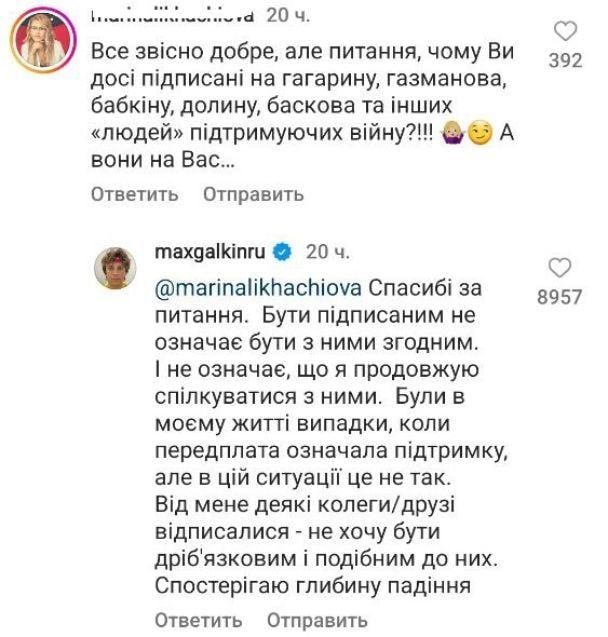 Максим відповів українською: «Спасибі за питання. Бути підписаним — не означає, бути з ними згодним. І не означає, що я продовжую спілкуватися з ними. Були в моєму житті випадки, коли передоплата (підписка. — Авт.) означала підтримку, але в цій ситуації це не так. Від мене деякі колеги/друзі відписалися — не хочу бути дріб'язковим і подібним до них. Спостерігаю глибину падіння».