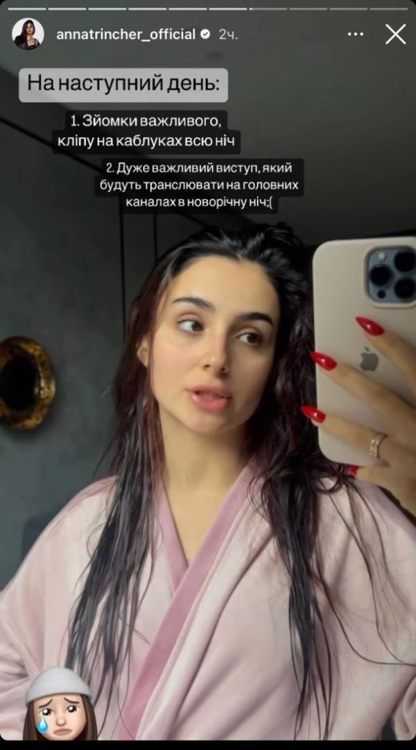 «Найбільше я була засмучена через те, що наступного дня у мене знімання дуже важливого кліпу. Нічна зміна, у якій будуть танцювальні частини, у якій абсолютно всі образи будуть на підборах, а також перед цим у мене концерт, де теж абсолютно все я буду танцювати і на підборах. І я була дуже засмучена, просто хотілося плакати», — поділилася Трінчер.