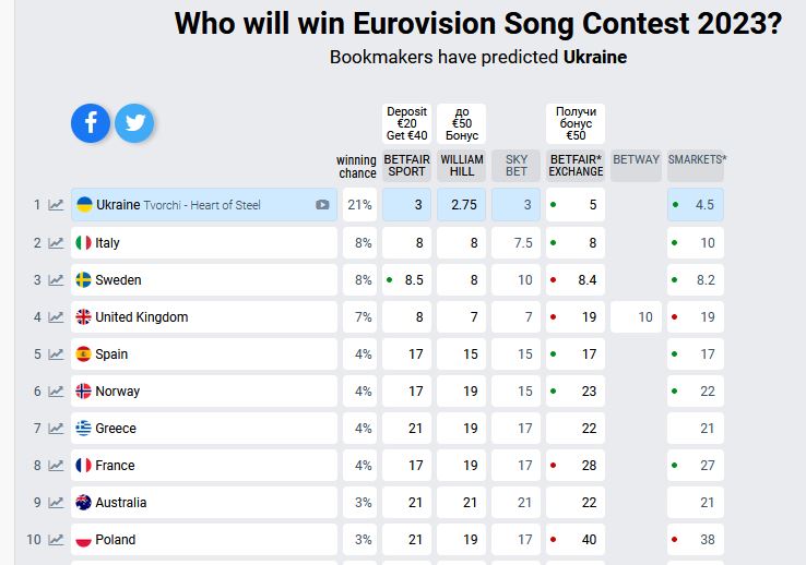 Дует TVORCHI, який із піснею Heart Of Steel став переможцем національного відбору на Євробачення-2023 в Україні, досить високо котирується у букмекерів.