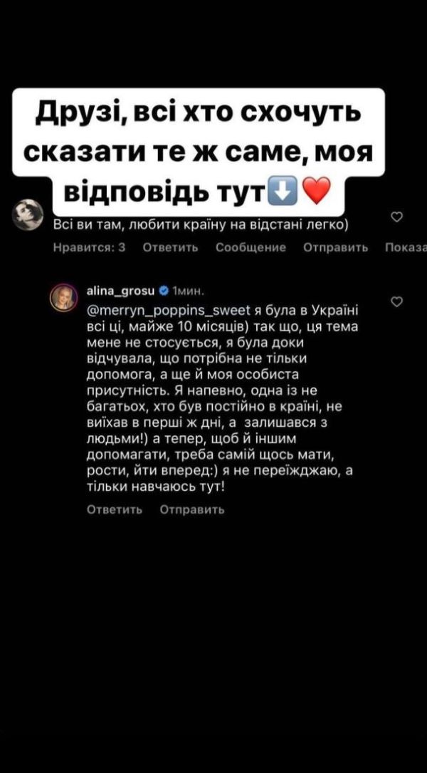 «Я була в Україні всі ці майже 10 місяців, так що ця тема мене не стосується. Я була, доки відчувала, що потрібна не тільки допомога, а ще й моя особиста присутність. Я, напевно, одна із небагатьох, хто був постійно в країні, не виїхав у перші ж дні війни, а залишався з людьми», — відповіла Гросу.