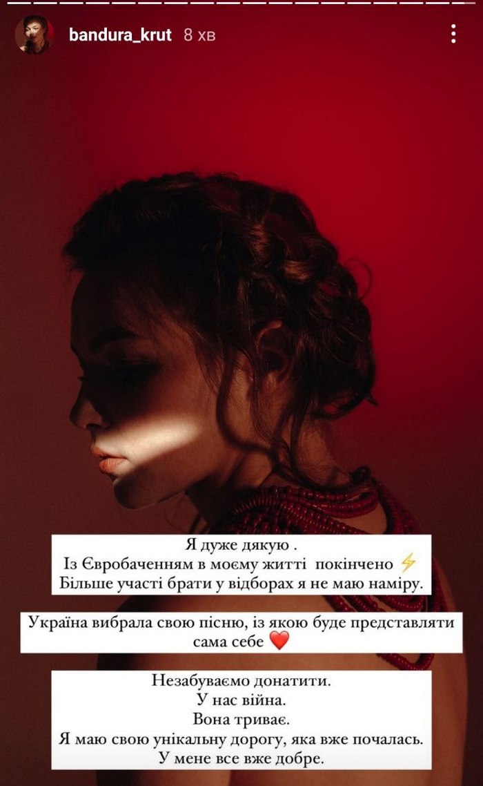 Бандуристка з Хмельницького Марина Круть (KRUTЬ) схоже, незадоволена фіналом пісенного конкурсу «Євробачення-2023», то ж більше туди ні ногою. Про це артистка, яка двічі боролась за перемогу, але не виграла, заявила у своїх сторіс в Instagram.