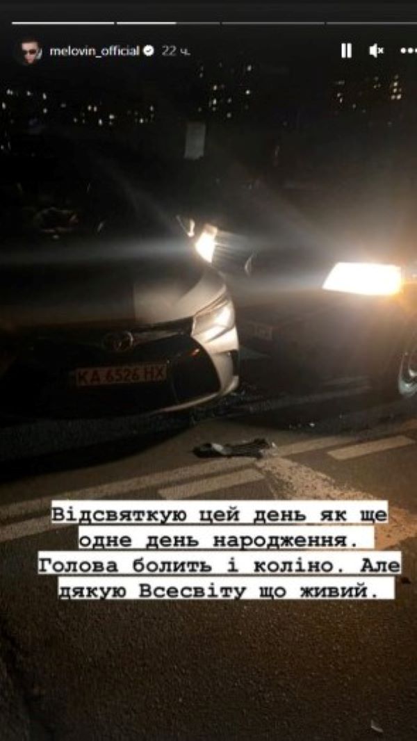 Про ДТП MELOVIN розповів на своїй сторінці в Інстаграм. Автопригоду музикант називає своїм другим днем народженням.
