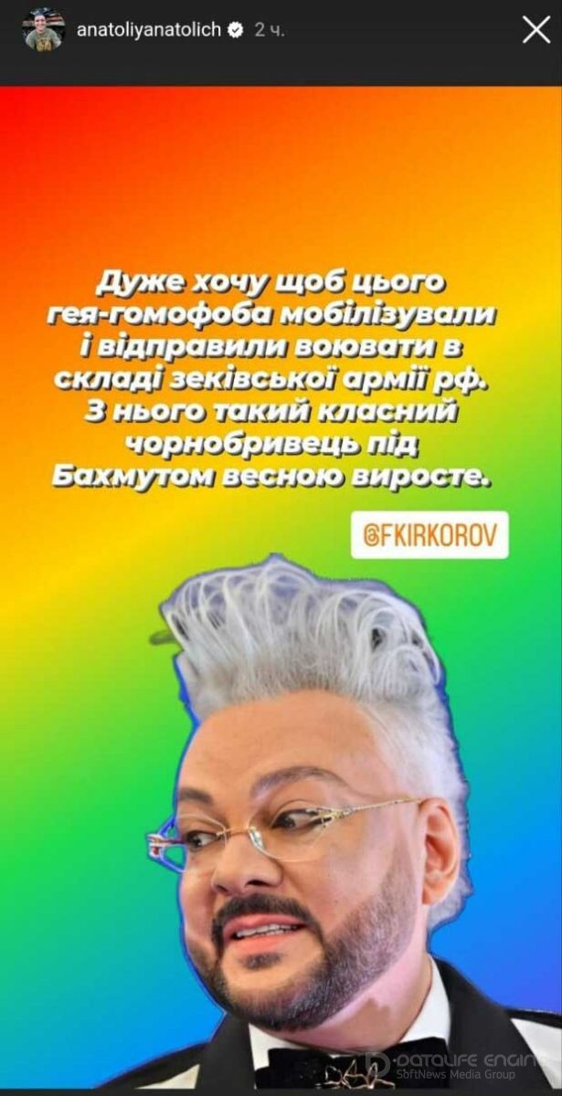 «Дуже хочу, щоб цього гея-гомофоба мобілізували та відправили воювати у складі зеківської армії росії. З нього такий класний чорнобривець навесні під Бахмутом проросте», — зазначив Анатолій Анатоліч в Instagram.