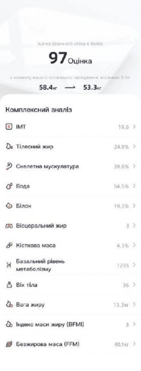 У своєму Telegram-каналі вона зізналася, що зараз має вагу 53,3 кг, а раніше важила 58,4 кг. Також артистка опублікувала показники маси тіла.
