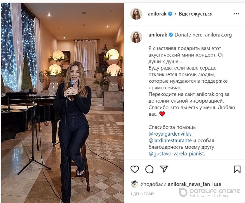 «Я щаслива подарувати вам цей акустичний міні-концерт. Від душі до душі … Буду рада, якщо ваше серце відгукнеться допомогти людям, які потребують підтримки прямо зараз. Переходьте на сайт за додатковою інформацією. Дякую, що ви є. Люблю вас», — написала виконавиця.