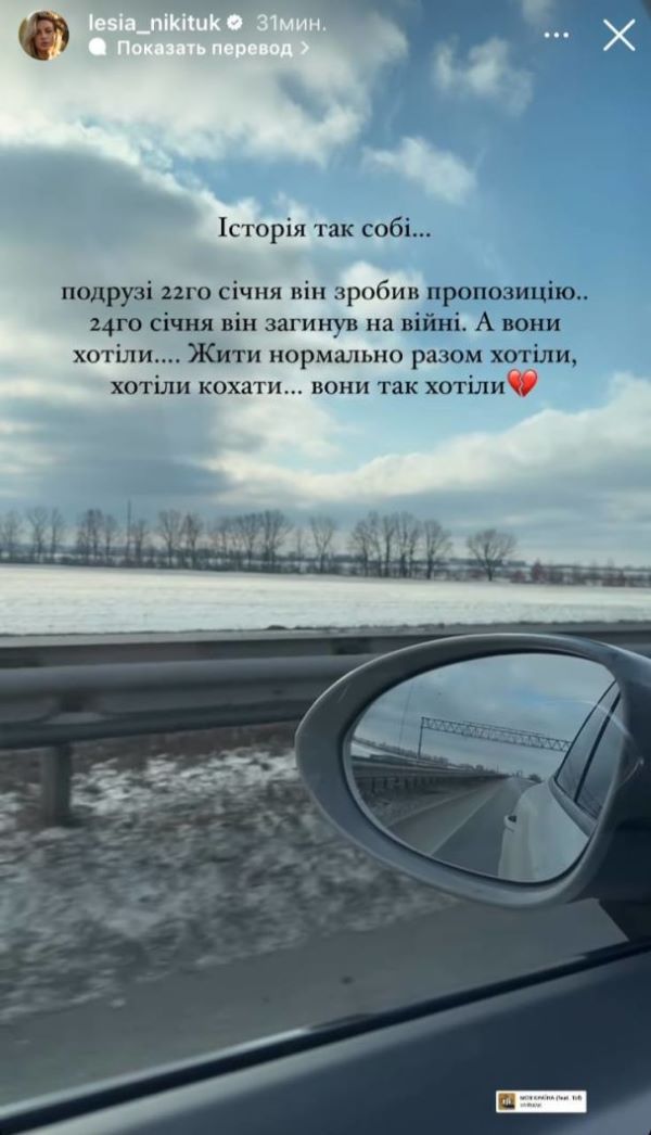 Телеведуча та блогерка Леся Нікітюк, яка випустила заспокійливу мантру, розповіла про особисту трагедію її близької подруги. Її наречений загинув, захищаючи нашу країну від російських загарбників. Закохані ще кілька днів тому були щасливими, будували плани на спільне майбутнє. Захисник освідчився коханій 22 січня, а 24 січня його вбили рашисти. Щемливу історію розповіла Леся в Інстаграм.