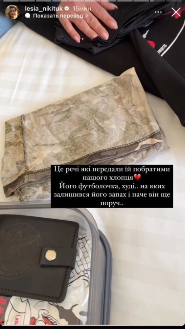 «Ми приїхали до Житомира, сюди привезли тіло нашого Героя. Тіло коханого моєї подруги. Вона така щаслива була останні чотири місяці. А зараз сама на себе не схожа, не їсть, не п'є… Тільки сльози та дим від цигарок… Побратими передали їй речі хлопця. Його футболочка, худі, на яких залишився його запах. Наче він ще поряд», — пише Нікітюк.
