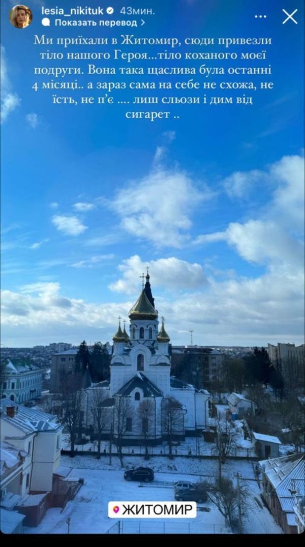 Ховали героя у Житомирі. Нікітюк разом із подругою вирушила туди, щоб віддати шану захиснику. «Подрузі 22 січня він зробив пропозицію… 24 січня він загинув на війні. А вони хотіли… Жити нормально разом хотіли, хотіли кохати… Вони так хотіли», — написала Леся.