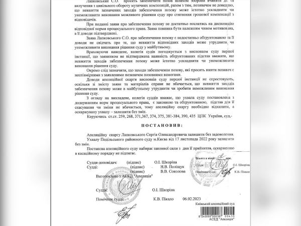 Зрештою крапку в судовій тяганині поставив суд. Київський Апеляційний суд 6 лютого 2023 року ухвалив рішення залишити скаргу позивача без розгляду.