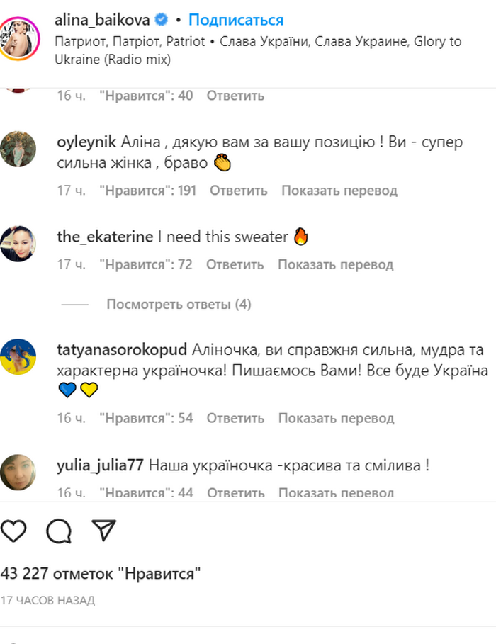 «Дякую вам за позицію. Ви суперсильна жінка, наша україночка» — пишуть фоловери Байковій.