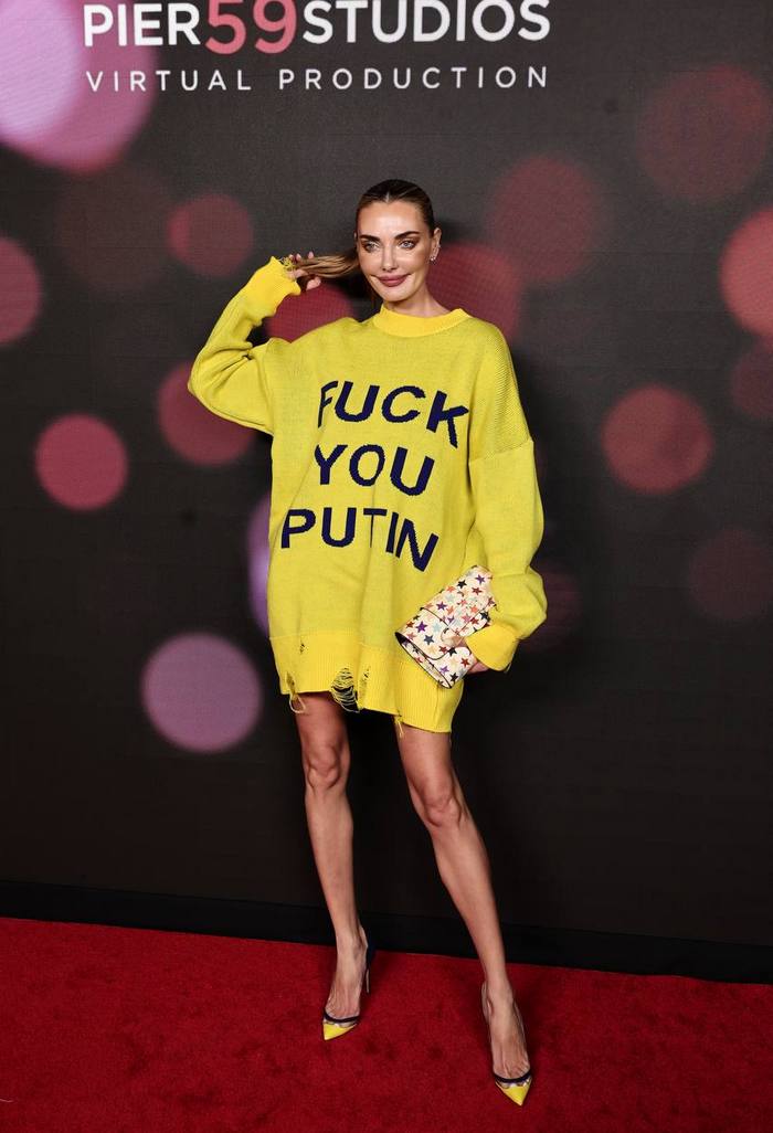 Українка відвідала вечірку відкриття Тижня моди в Нью-Йорку. Вона обрала вбрання оверсайз з максіджемпером українського бренду Vip Luxury Edition, що виконує роль мінісукні. Кольори українського прапора: жовте тло і сині друковані літери. Чи потрібно перекладати ці три слова — «Fuck You Putin»?