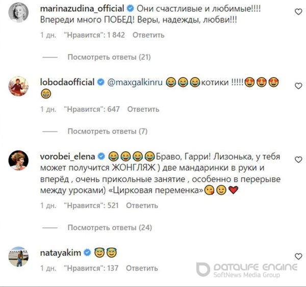Зіркові друзі сім'ї зворушилися публікацією. «Вони щасливі та кохані! Попереду багато перемог. Віри, надії, кохання», — написала Марина Зудіна. «Браво, Гаррі! Лізонько, у тебе може вийти жонгляж. Дві мандарини в руки — і вперед! Дуже прикольне заняття, особливо у перерві між уроками. Циркова перерва», — порадила дівчинці Олена Воробей. Також серед перших під публікацією відзначилася Світлана Лобода.