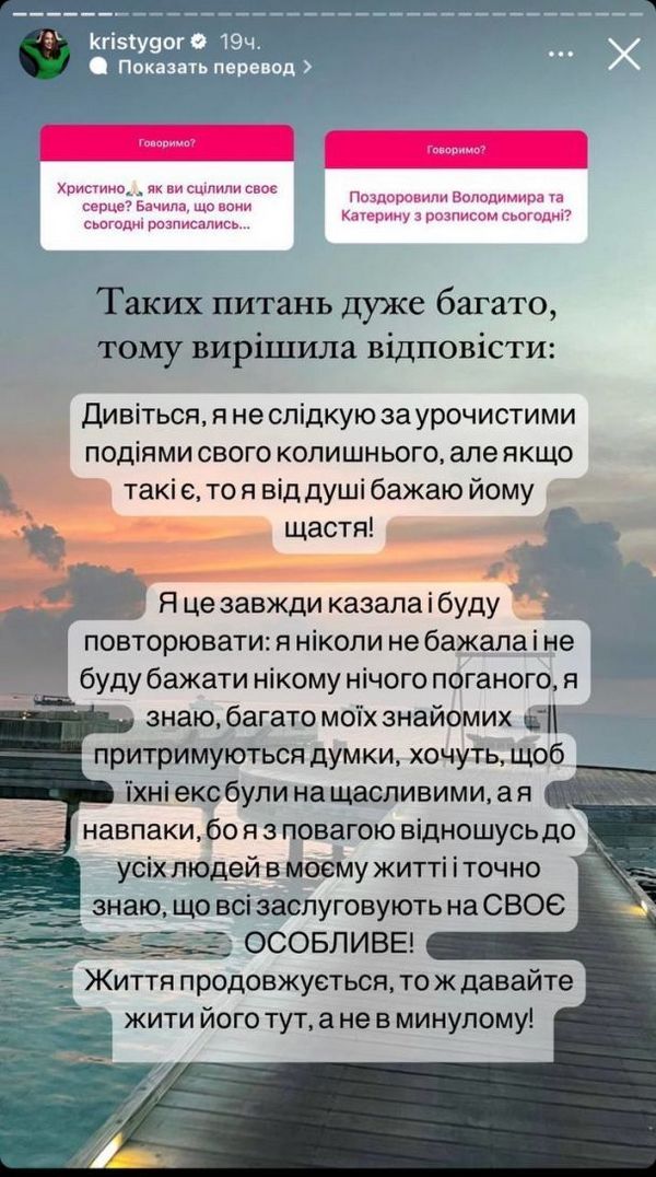 «Я це завжди казала і буду повторювати: я ніколи не бажала і не буду бажати нікому нічого поганого. Я знаю, багато моїх знайомих хочуть, щоб їхні екси не були щасливими, а я навпаки, бо з повагою ставлюся до усіх людей у моєму житті і точно знаю, що всі заслуговують на своє особливе. Життя продовжується, тож давайте жити його тут, а не в минулому. Я не слідкую за урочистими подіями свого колишнього, але якщо такі є, то я від душі бажаю йому щастя», — прокоментувала Христина.