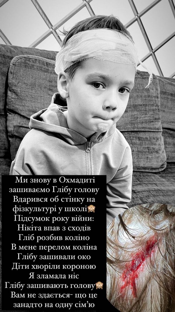 «Ми знову в Охматдиті, зашиваємо Глібу голову. Вдарився об стінку на фізкультурі у школі. Підсумок року війни: Нікіта впав зі сходів, Гліб розбив коліно. В мене перелом коліна, Глібу зашивали око. Діти хворіли короною. Я зламала ніс. Глібу зашивають голову. Вам не здається, що це занадто на одну сім'ю. Що в нас за сімейка, я не розумію. Щось робиться. Хтось наврочив, чи що», — написала Ганна.