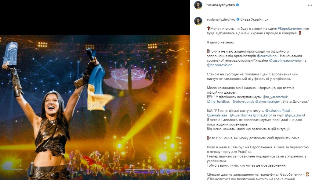 Однак Руслана у своєму дописі в Інстаграм стверджує, що має запрошення лише на участь в івентах для єврофанів. Про виступи у напівфіналах чи фіналі не йдеться.