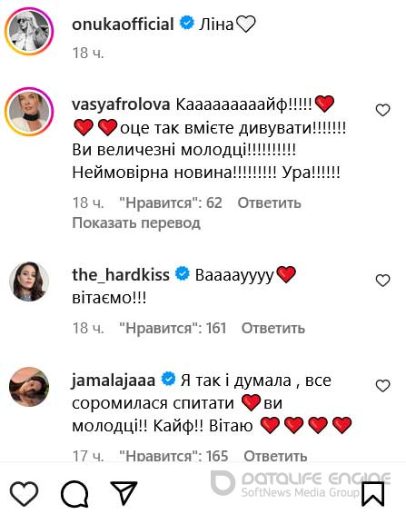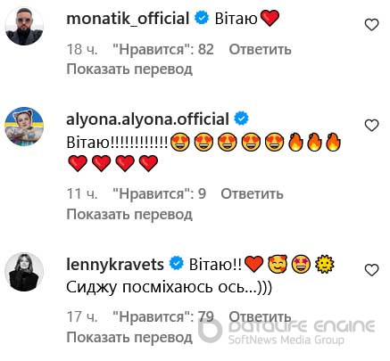 Друзі співачки залишили під постом безліч привітань. Відзначилися колеги по сцені Джамала, Юлія Саніна, Монатик, Альоша, Альона-Альона, телеведуча Василіса Фролова та актриса «Квартал 95» Олена Кравець.
