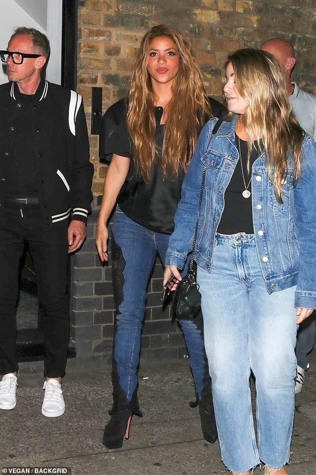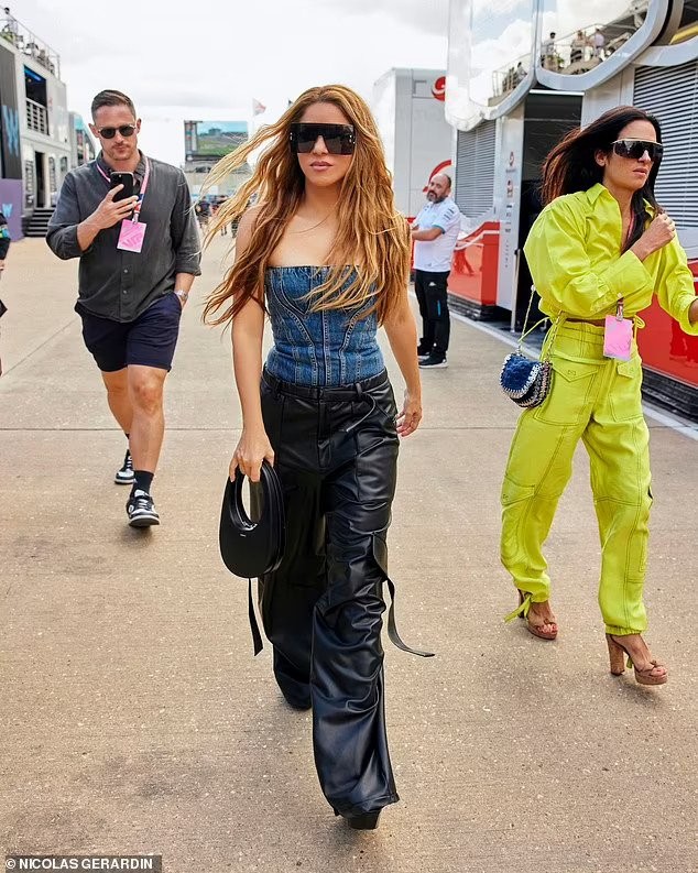 Шакіра продемонструвала свій бездоганний стиль у Сільверстоуні, з'явившись у джинсовому топі-корсеті та широких шкіряних штанах чорного кольору. Її золоті локони спадали вільними хвилями, і вона несла чорну шкіряну сумочку.