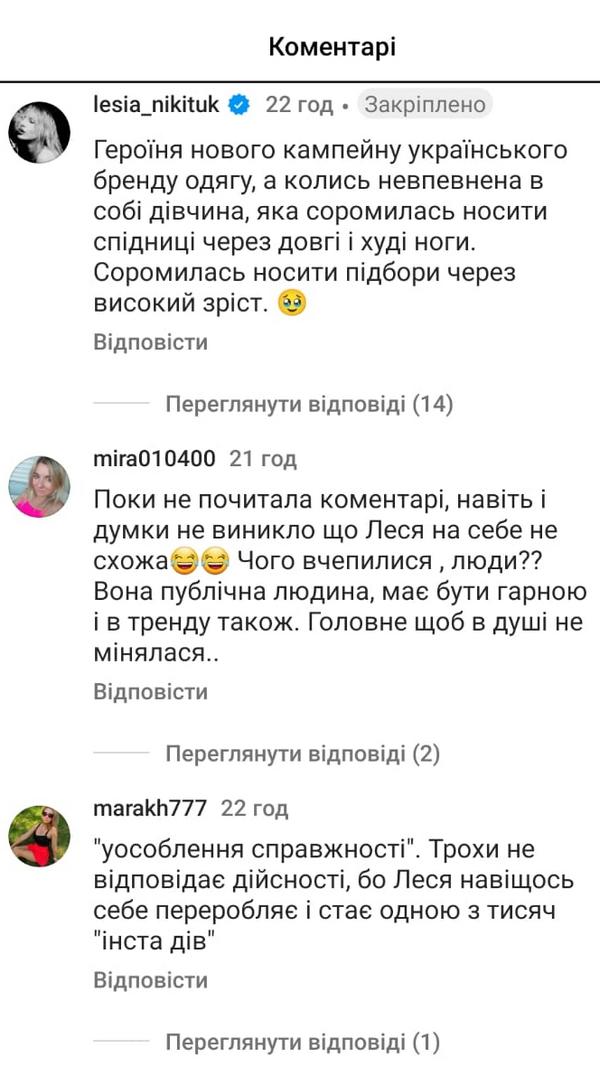 «Героїня нового кампейну українського бренду одягу, а колись невпевнена в собі дівчина, яка соромилась носити спідниці через довгі і худі ноги. Соромилась носити підбори через високий зріст», — написала Леся.