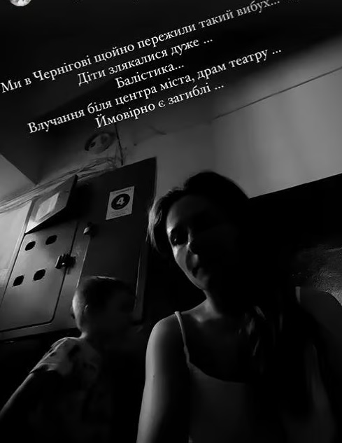 «Ми в Чернігові, щойно пережили такий вибух. Діти злякалися дуже. Балістика. Влучання біля центру міста, драмтеатру», — підписала світлину, на якій зображена із сином у під'їзді будинку, Денисенко.