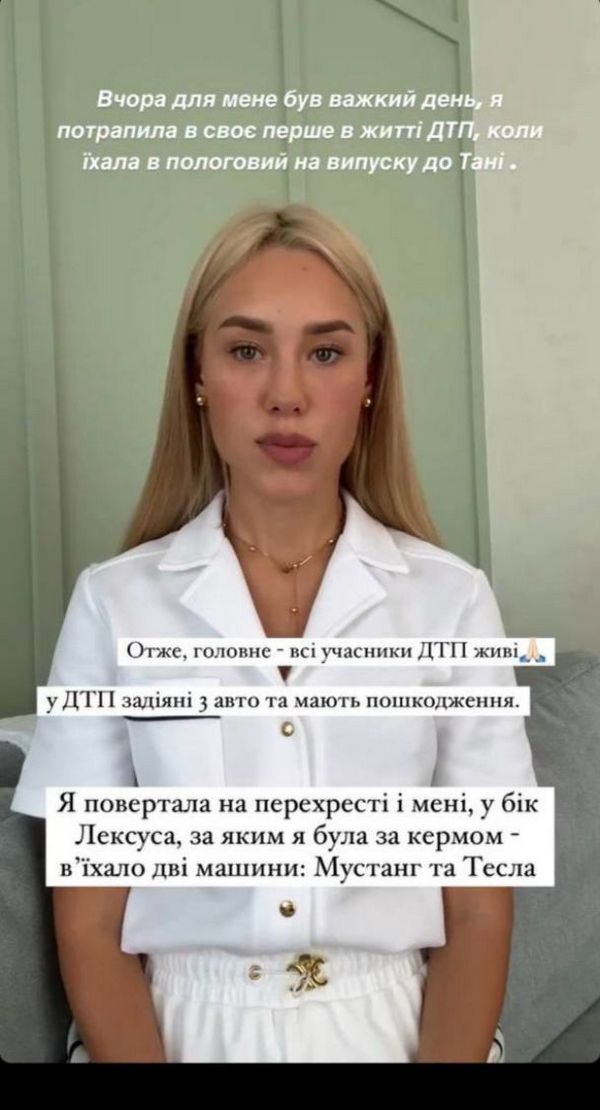 «Вчора для мене був складний день. Я потрапила в свою першу в житті ДТП, коли їхала до пологового на виписку до Тані. Отже, головне — всі учасники ДТП живі. У ДТП залучені три авто, які мають пошкодження. Я повертала на перехресті і мені у бік Lexus, за яким я була за кермом, в'їхало дві машини: Mustang та Tesla», — розповіла Даша.