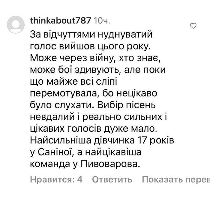 «За відчуттями нуднуватий голос вийшов цього року, — написали у коментарях. — Може через війну, хто знає, може бої здивують, але поки що майже всі сліпі перемотувала, бо нецікаво було слухати…»