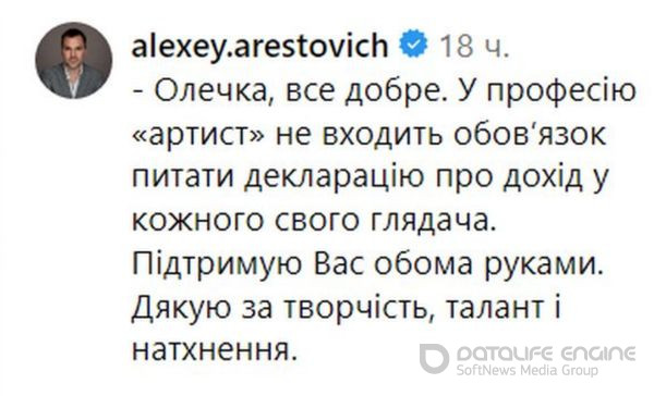 «Олечка, все добре. У професію „артист“ не входить обовʼязок питати декларацію про дохід у кожного свого глядача. Підтримую вас обома руками. Дякую за творчість, талант і натхнення», — написав він у коментарі.