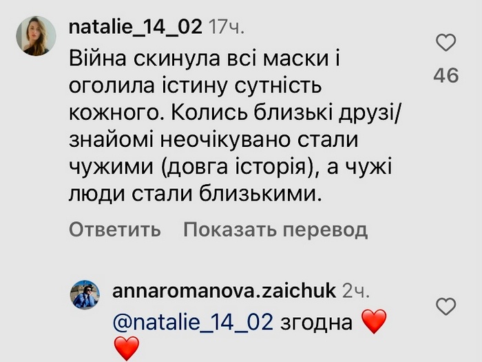 «Війна скинула всі маски і оголила істину сутність кожного, — написали у відповідь. — Колись близькі друзі неочікувано стали чужими, а чужі люди стали близькими».