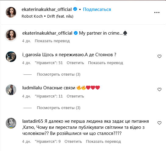 Під іншою фотографією, на якій балерина позує з «партнером зі злочину», інтернет-користувачі не лише робили їй компліменти, а й активно цікавилися, де її чоловік.