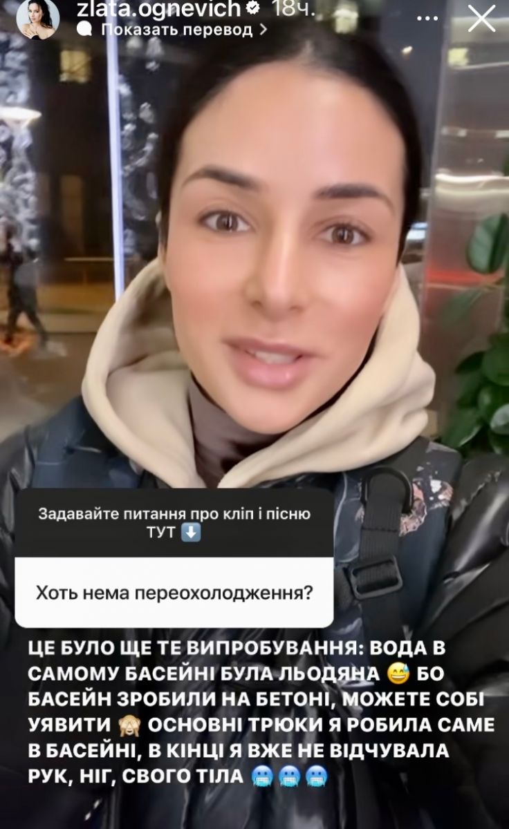 Популярна співачка Злата Огнєвіч, яка нещодавно випустила відвертий кліп, вразила шанувальників у мережі подробицями його зйомок. Нагадаємо, у відео Злата, демонструючи відмінну фізичну форму, робить всілякі гімнастичні фігури під зливою. Виявилось, що зйомки проходили у порожньому басейні, а співачці довелося довгий час знаходитися у холодній воді. РЕКЛАМА
