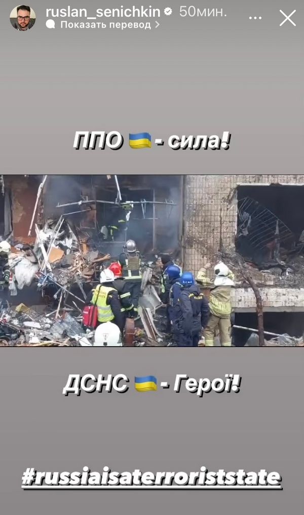 Телеведучий Руслан Сенічкін після важкого ранку подякував силам ППО та ДСНС. «Герої!» — написав Руслан на своїй сторінці у соціальній мережі.