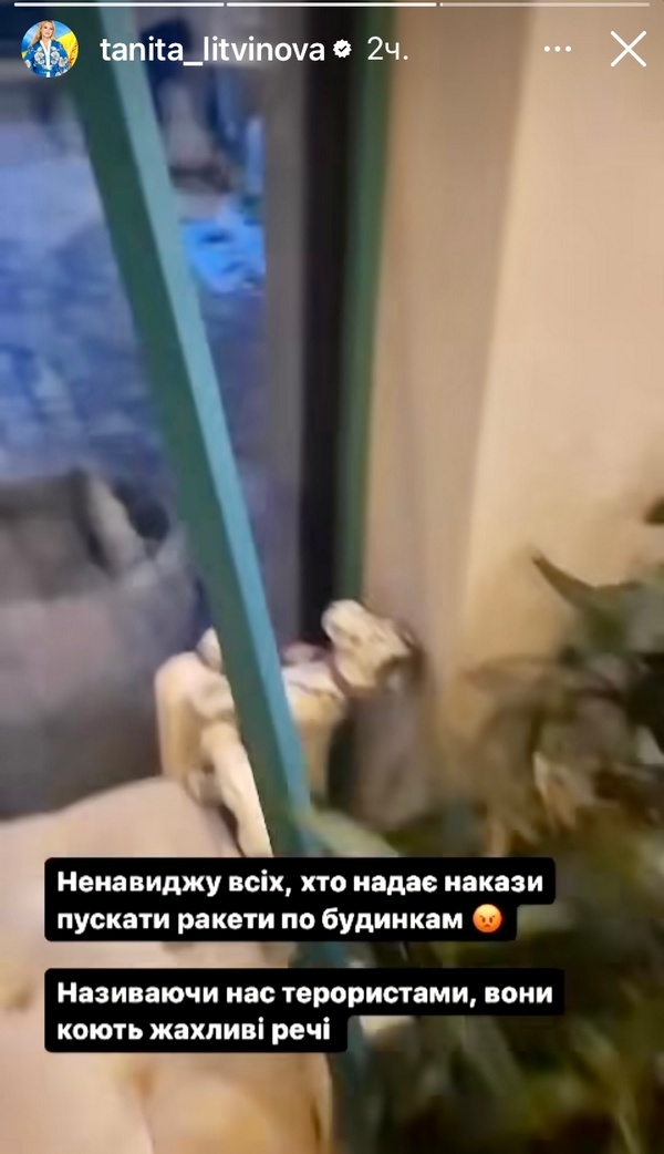 «Сьогодні дісталось і моєму будинку, — написала Тетяна. — Не уявляю, як тим людям в багатоповерхівках. Ненавиджу всіх, хто віддає накази пускати ракети по будинкам! Називаючи нас терористами, вони коють жахливі речі».