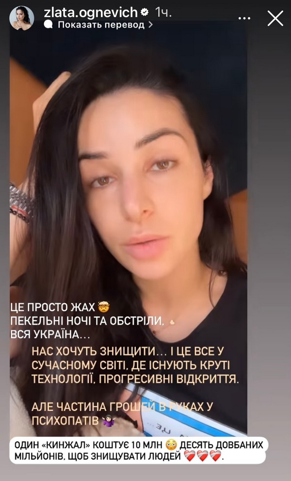 «Це просто жах, — відреагувала Злата Огнєвич на ранковий обстріл України. — Боже, якщо ти існуєш, віднови рівновагу. Хай зникнуть ті, хто її порушив. Щоб всі випущені ракети помножились на 10 000 і повернулись туди, звідки їх випустили. І там розірвались. Нелюди…»РЕКЛАМА