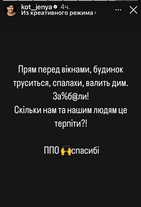Емоційно відреагував і відомий танцівник Євген Кот: «Прям перед вікнами. Будинок труситься, спалахи, валить дим…»РЕКЛАМА