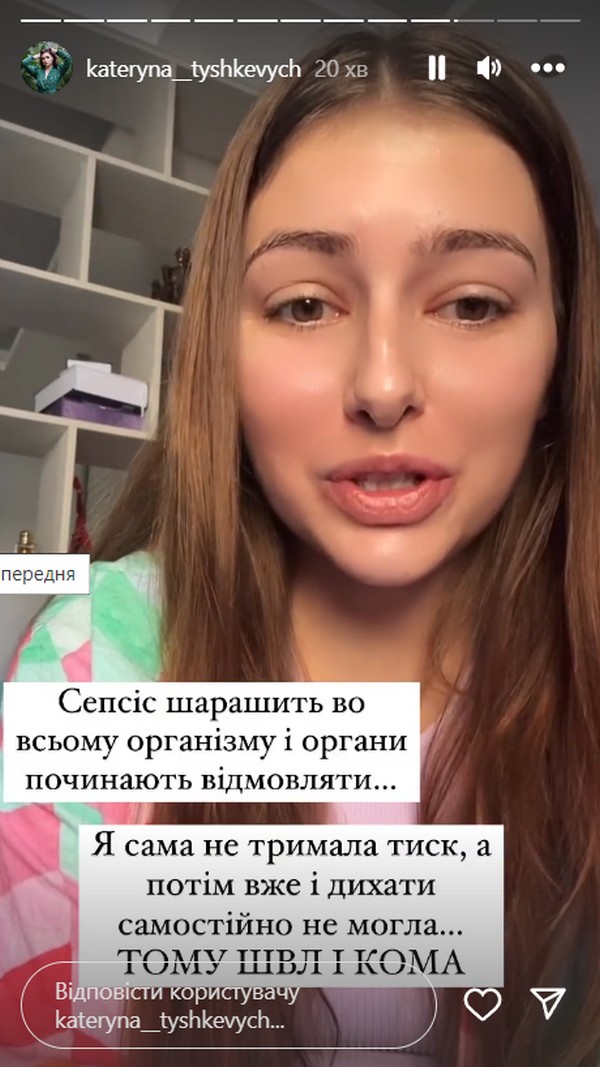 «Температура доходила до 40 і майже не збивалася. Тому ми прийняли рішення викликати швидку. В приватній клініці мені зробили різні тести й аналізи. Мій стан погіршувався, я марила. Я так розумію, що в мене почала відмовляти печінка та інші органи, почався сепсис. Тобто через катетер потрапила в організм інфекція», — розкрила подробиці Катерина.РЕКЛАМА