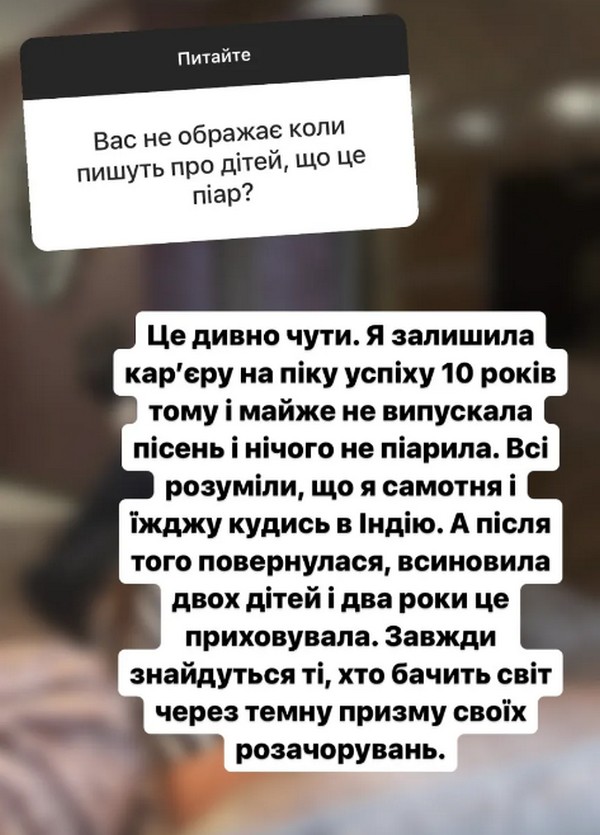 «Я залишила кар'єру на піку успіху 10 років тому і майже не випускала пісень і нічого не піарила. Усі розуміли, що я самотня і їжджу кудись в Індію. А після того повернулася, всиновила двох дітей і два роки це приховувала. Завжди знайдуться ті, хто бачить світ через призму своїх розчарувань», — відповіла Могилевська.