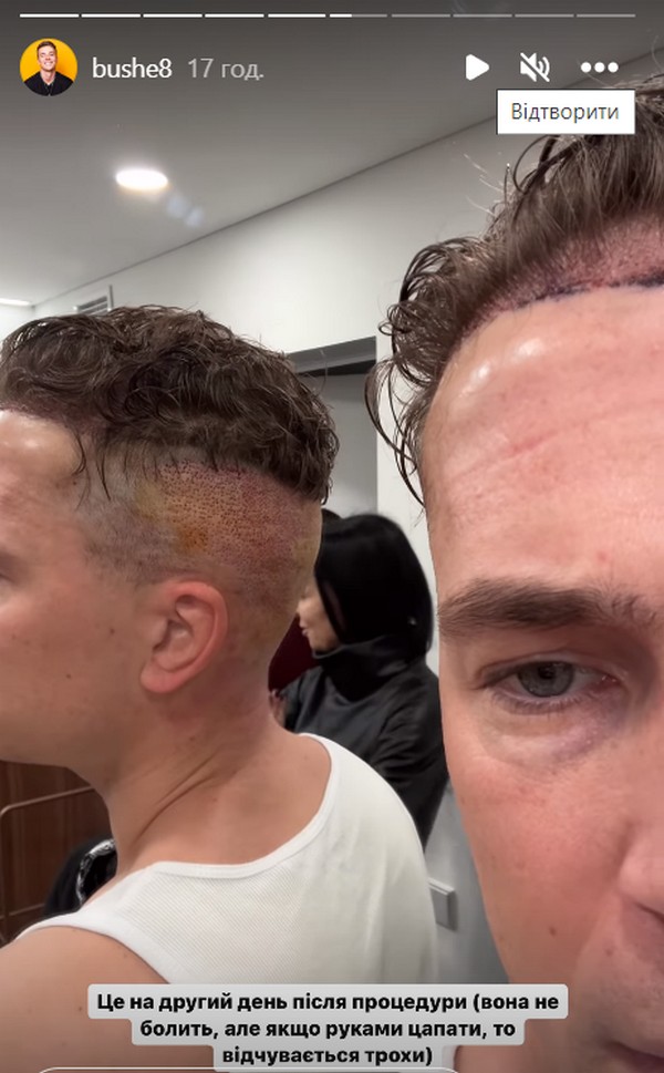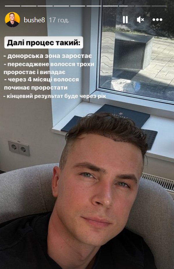 Процедура тривала близько п’яти годин. Йому пересадили волосся з потиличної зони на скроневу. Шелудяк показав, як саме відбувалася процедура та її результат за кілька днів.