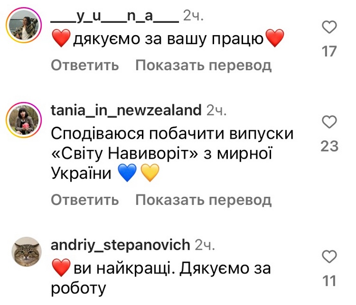«Сподіваюся побачити випуски „Світу Навиворіт“ з мирної України», — написав коментатор.РЕКЛАМА