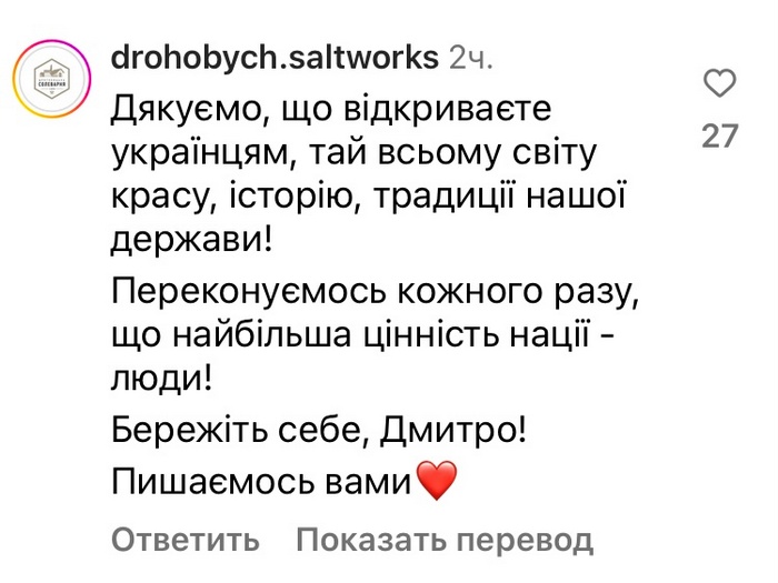 «Ми багато мандрували світом до повномасштабної війни і добре розуміємо, що такі саме традиції допомагають нації бути відомою на весь світ, — написав Дмитро на своїй сторінці у соціальній мережі. — Якщо ти пам’ятаєш своє минуле, у тебе є майбутнє. Добре, що навіть зараз традиції зберігаються і не втрачаються. Взагалі сьогодні фокус всьго світу — саме на Україні. З лютого 2022 року я жодного дня не був за кордоном та знімаю документальні проєкти виключно в Україні. І на фронті, і в тилу».