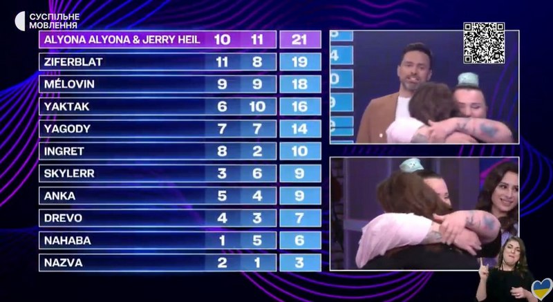 Отже за сумою балів перемогли alyona alyona & Jerry Heil, які і поїдуть на конкурс в Мальме.