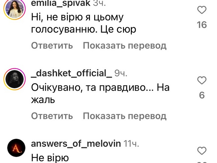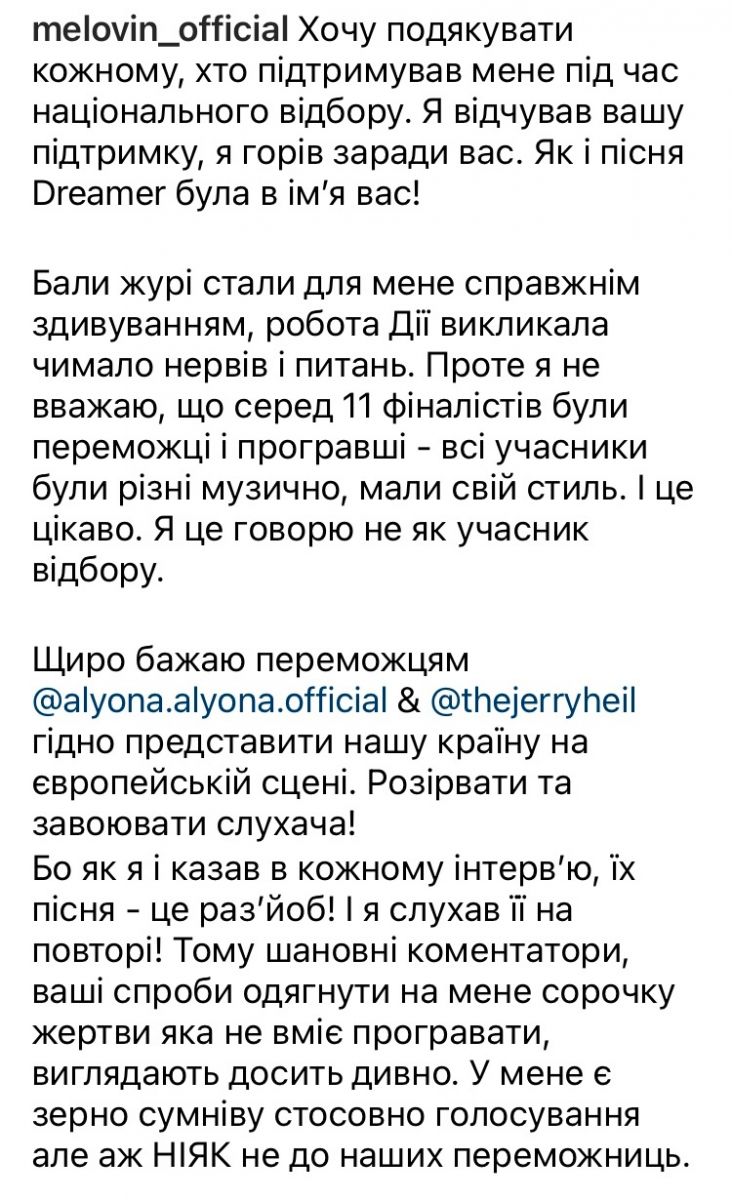 «Ваші спроби одягнути на мене сорочку жертви, яка не вміє програвати, виглядають досить дивно, — написав артист. — У мене є зерно сумніву стосовно голосування, але аж ніяк до наших переможниць».РЕКЛАМА