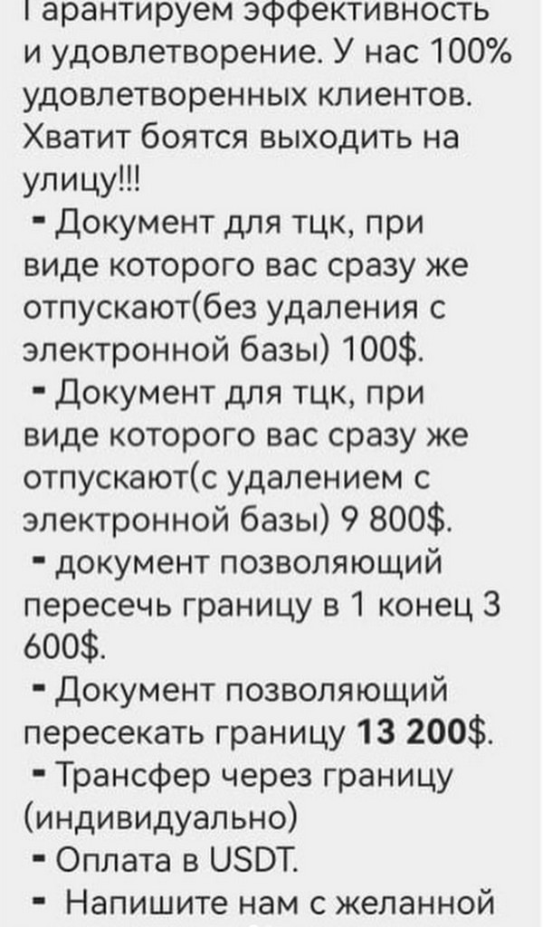 Шахраї використали ім’я відомого громадського діяча та волонтера Сергія Притули. Вони розсилають повідомлення начебто від імені його команди, в яких пропонують допомогу в оформленні документів, як уникнути мобілізації та виїхати за кордон. Одразу озвучують розцінки. Зокрема, за документ, який дозволяє перетинати кордон просять 13200 доларів. При чому, повідомлення розсилають російською мовою.ВІДЕО ДНЯ