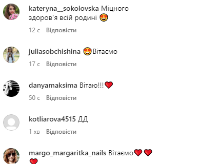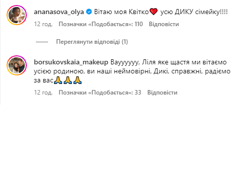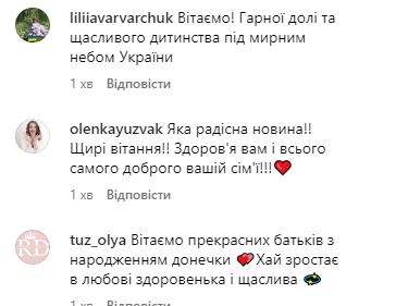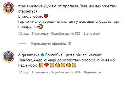 Колеги та фоловери вітали родину з нароженням дитини. Зокрема, Лілію та Андрія привітала актриса Ольга Сумська.