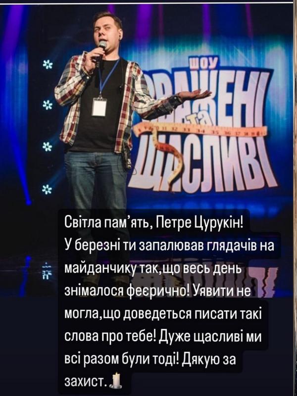 «Світла память, Петре Цурукін! У березні ти запалював глядачів на майданчику так, що весь день знімалося феєрично. Уявити не могла, що доведеться писати такі слова про тебе! Дуже щасливі ми тоді всі разом були. Дякую за захист», — написала ведуча Роза Альнамрі.