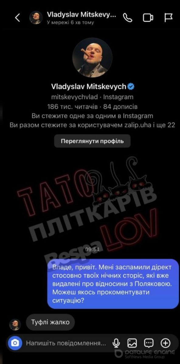 В той же час на ранок він видалив всі сторіз, у яких розповідав про роман нібито з Поляковою. В той же час вони всі виявилися у «тата пліткарів» Богдана Беспалова, який опублікував їх і звернувся до Влада Міцкевича за коментарем, аби той пояснив, що це було вночі. На що той лакончіно відповів, що йому «шкода туфлі».РЕКЛАМА