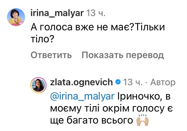 «Іриночко, в моєму тілі, окрім голосу, є ще багато всього», — відреагувала сама Злата.