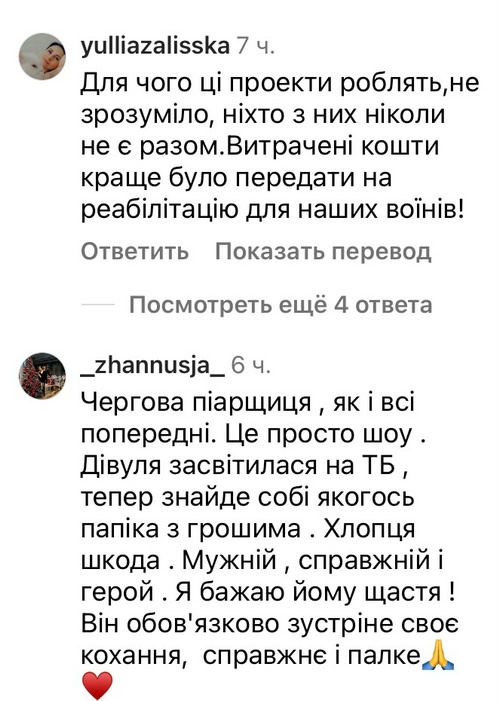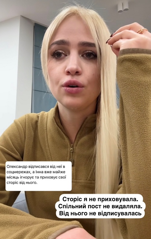 «Сторіз я не приховувала, спільний пост не видаляла, від нього не відписувалася, — наголосила дівчина. — Я реально намагалася будувати стосунки на проєкті і після нього. Я не хочу цих суперечок через те, що це ветеран війни, який втратив ноги. У мене зв'язані руки… Я завжди його підтримувала і ніколи в житті не казала жодного поганого слова і не буду заради схвалення аудиторії поливати брудом людину, з якою хотіла побудувати стосунки».