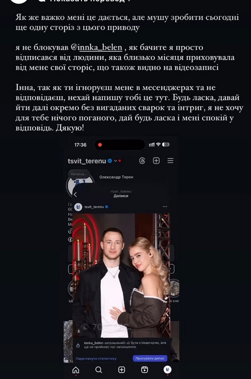 Пара тринадцятого сезону романтичного реаліті «Холостяк», яка оголосила про розставання, продовжує зʼясовувати стосунки. Сашко «Терен» та Інна Бєлєнь не спілкуються особисто, а викладають свої думки та претензії на сторінках у соціальній мережі. За словами «Терена», Інна відписалася від нього у мережі, заблокувала сторіз та ігнорує його у мессенджерах.ВІДЕО ДНЯ