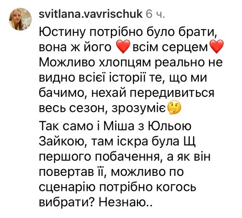 «Юстину потрібно було брати, вона ж його всім серцем, — згадали одну з учасниць сезону. — Можливо хлопцям реально не видно всієї історії те, що ми бачимо, нехай передивиться весь сезон, зрозуміє».